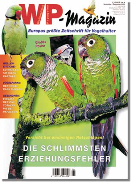 Partnerwahl bei Wellensittichen Heike Kalbus Inhalt: In einem Wellensittichschwarm ist es spannend zu beobachten, welche Vögel sich zu einem Paar zusammenfinden. Doch woran orientieren sich die Vögel bei der Wahl ihrer Partner? Und wie ist es um die lebenslange Treue bestellt, die Wellensittichen nachgesagt wird? Frau Kalbus ist diesen Fragen nachgegangen und schildert in diesem Artikel Theorien, Beobachtungen sowie wissenschaftliche Erkenntnisse. Der Fächerpapagei Inhalt: Sucht man innerhalb der großen Papageienfamilie nach ungewöhnlichen Arten, wird man zwangsläufig auf den Fächerpapagei (Deroptyus accipitrinus) stoßen. Der aufstellbare „Kragen“ aus leuchtend roten Federn mit blauen Endsäumen ist das unverwechselbare Merkmal dieser Spezies, die den Wissenschaftlern bis heute erhebliche Mühe bei der verwandtschaftlichen Einordnung bereitet. Diese Unsicherheit führte dazu, dass die prachtvollen Vögel in Papageienbüchern oftmals als letzte vorgestellt werden, mit dem Vermerk: „Ursprung unklar, möglicherweise mit den Amazonen verwandt“. Phytotherapie bei Vögeln Nicola Traeger Inhalt: Der bekanntere Ausdruck für „Phytotherapie“ ist sicherlich Kräuterheilkunde. Sie wurde schon in der Antike beschrieben und in allen alten Kulturen durch Heiler und Schamanen praktiziert. Das Wissen um die heilenden Substanzen in unseren Wildpflanzen kann auch zum Wohl unserer Heimvögel eingesetzt werden. Lesen Sie hierzu den Beitrag von Tierheilpraktikerin Nicola Traeger aus Essen. Frei fliegende Agaporniden: Birds in Paradise Manfred Büst Inhalt: Im Landkreis Plön (Schleswig-Holstein) lassen sich sommertags nicht nur einheimische Vögel beobachten, sondern auch die frei fliegenden Agaporniden von Manfred Büst aus Giekau. Über seine außergewöhnliche Papageienhaltung mit Freiflug der besonderen Art hat er für das WP-Magazin diesen Bericht geschrieben. Hauruck! ... und nichts geht mehr! Hildegard Niemann Inhalt: Viele Papageienfreunde sind vor allem von den großen Arten fasziniert. Aras, Kakadus, Graupapageien und Amazonen sind allerdings in der Haltung keine ganz einfachen Pfleglinge, die grobe oder fahrlässige Haltungsfehler schnell übel nehmen und mit Beißen, Schreien oder Rupfen reagieren. – Gute Ratschläge von vermeintlichen „Papageienexperten“ zur Erziehung oder Disziplinierung von „ungehorsamen“ Papageien gibt es schnell und reichlich. Sie alle versprechen eine Problemlösung „ruck, zuck“, verschlimmern aber in der Regel die Situation daheim erheblich oder fördern sogar die Ausbildung von Verhaltensauffälligkeiten. Mehr zu dem Thema lesen Sie in diesem Bericht der Diplom-Biologin Hildegard Niemann. Sind Mahonien-Beeren für Papageien geeignet? Dr. Rainer Niemann Inhalt: Unser Leser Bernhard Hoffmann aus Berlin stellte uns folgende Frage: Die Antwort von Dr. Rainer Niemann lesen Sie in diesem Bericht. Buchvorstellung: Natürliche Kindheit Julia & Roland Seitre Inhalt: „Ariane war noch keine drei Jahre alt und liebte Tiere über alles. Sie genoss es sehr, die zahlreichen frei lebenden Sittiche im Lamington-Nationalpark in Australien füttern zu können, die über viele Jahre sehr zutraulich geworden sind. Über Stunden stand sie da, mit ausgestreckten Armen und ihren Händen voll mit Samenkörnern, mit denen sie die leuchtend bunten Vögel anlockte. Diese wirbelten im rasanten Flug um sie herum. Ariane war begeistert von der Farbenpracht und den Rufen ihrer gefiederten Freunde, dass sie die kleinen Wunden, welche die scharfen Krallen der Sittiche auf ihrer zarten Haut hinterließen, gar nicht wahrnahm. Ohne Unterbrechung redete sie mit den Papageien und versuchte, das Futter möglichst gerecht unter ihnen zu verteilen.“ Lesen Sie in diesem Text der Seitres mehr über die Erlebnisse ihrer Familie in den unterschiedlichsten Winkeln der Erde, die sie in einem Buch, welches hier ebenfalls vorgestellt wird, niedergeschrieben haben. Der T-Stand – eine Bauanleitung Sven Fischer Inhalt: Papageien benötigen permanente intellektuelle Forderung durch besondere Trainingseinheiten, um einen emotional ausgeglichenen Alltag zu erleben. Hinzu kommt, dass viele Papageien ihren Halter gern begleiten, wenn dieser verschiedenen Tätigkeiten im Haushalt nachgeht. Jeder Halter weiß aber auch, dass sein Papagei nicht überall sitzen kann oder darf. Eine wichtige Hilfe im Alltag ist daher der T-Stand, der sowohl als transportabler Freisitz, aber auch als Trainingsstand für spezielle Spielübungen dient. T-Stände kann man bisher leider kaum kommerziell erwerben. Deshalb zeigen wir an dieser Stelle eine Bauanleitung für dieses praktische Hilfsmittel. Graça Estrela – a Graça das Aras Dr. Hadumoth Radegundis Scholpp Inhalt: Die brasilianische Papageienmalerin Graça Estrela präsentierte in München auf Einladung des Deutsch-Brasilianischen Kulturvereins ihre Ausstellung „A Graça das Araras“, welche vom 17. bis 30. Juni 2005 im INTERIM, dem Laimer Kulturzentrum, stattfand. Die in Goiânia (Goiás) lebende Künstlerin widmet sich dem Schutz der Aras („Paradiesvögel“). Wegen ihrer Leidenschaft für diese Vögel wurde sie – nach dem Titel ihrer Ausstellung 1997 in London – bekannt als „Graça das Araras“. Mehr zu der Künstlerin und ihrem Wirken in diesem Artikel. Tukane – Perlen des tropischen Amerikas Harald Wullner Inhalt: Tukane werden heute in sechs Gattungen mit 40 Arten und 79 Unterarten aufgeteilt. In seinem Bericht stellt Ihnen Harald Wullner aus Bietigheim speziell den wohl bekanntesten Tukan in Menschenobhut vor. Es ist der Fischertukan (Ramphastos sulfuratus), der wegen seiner prächtigen Farben oft auch „Regenbogentukan“ genannt wird. Vogelpark Marlow Ines Engelbrecht Inhalt: Die vorpommersche Landschaft mit ihren grünen sanften Hügeln und dichten Wäldern begleitet den Besucher des Vogelparks nach Marlow. Gute Ausschilderungen lassen auch den Fremden leicht das Ziel finden. Ein großzügiger kostenfreier Parkplatz steht hier z